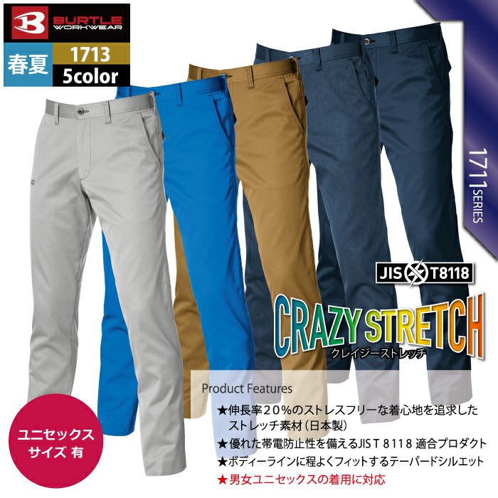 ストレッチ&テーパードシルエットの人気シリーズ バートル BURTLE 作業着 作業ズボン 1713 ユニセックスパンツ 4L 作業服 春夏 ストレッチ ユニセックス 制電 T8118 テーパード