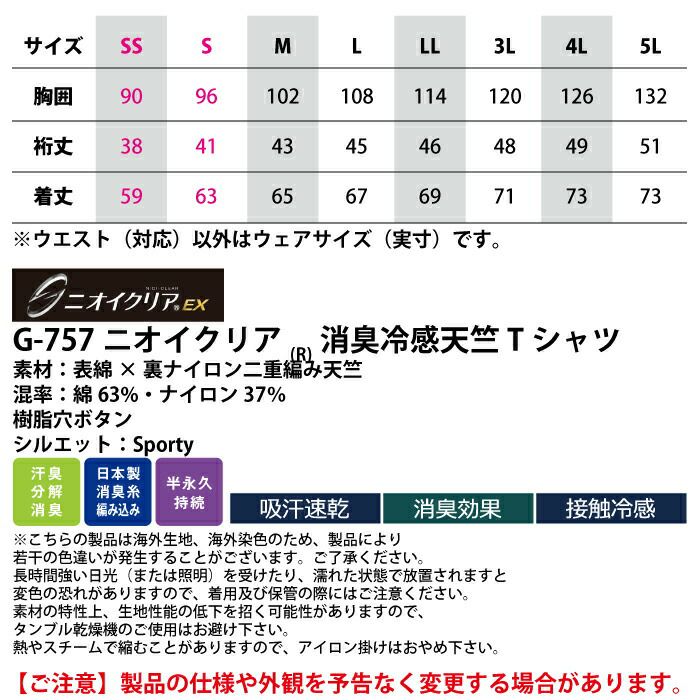 コーコス 作業服 作業着 作業ズボン コーコス 作業服 春夏用 G-757 ニオイクリア消臭冷感天竺Tシャツ SS-LL