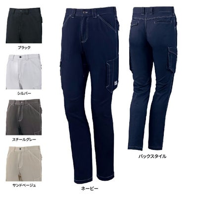 ●関連商品※75700ストレッチ長袖ジャンパー※75704ストレッチ長袖シャツ※75802ストレッチノータックカーゴパンツ●春夏用●素材:ストレッチミニヘリンボン 綿60%・ポリエステル38%・ポリウレタン2%●ストレッチ、カーゴポケットがベルトに隠れないデザイン仕様、ワンポイント(後ろポケット)、ベンチレーション(メッシュ)、右カーゴ二重ポケット、革ラベル(人工皮革)、カラビナループ、股ガゼット●サイズ:73(ウエスト/73、ヒップ/92、ワタリ幅/30、股下/82)、76(ウエスト/76、ヒップ/95、ワタリ幅/31、股下/82)、79(ウエスト/79、ヒップ/98、ワタリ幅/32、股下/82)、82(ウエスト/82、ヒップ/102、ワタリ幅/33.5、股下/82)、85(ウエスト/85、ヒップ/106、ワタリ幅/35、股下/82)、88(ウエスト/88、ヒップ/110、ワタリ幅/36.5、股下/82)、91(ウエスト/91、ヒップ/114、ワタリ幅/38、股下/82)、96(ウエスト/96、ヒップ/120、ワタリ幅/40、股下/82)、101(ウエスト/101、ヒップ/126、ワタリ幅/43、股下/82)、106(ウエスト/106、ヒップ/132、ワタリ幅/45、股下/82)、112(ウエスト/112、ヒップ/140、ワタリ幅/47、股下/82)●カラー:ネービー、シルバー、ブラック、サンドベージュ、スチールグレー