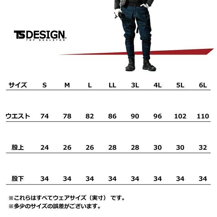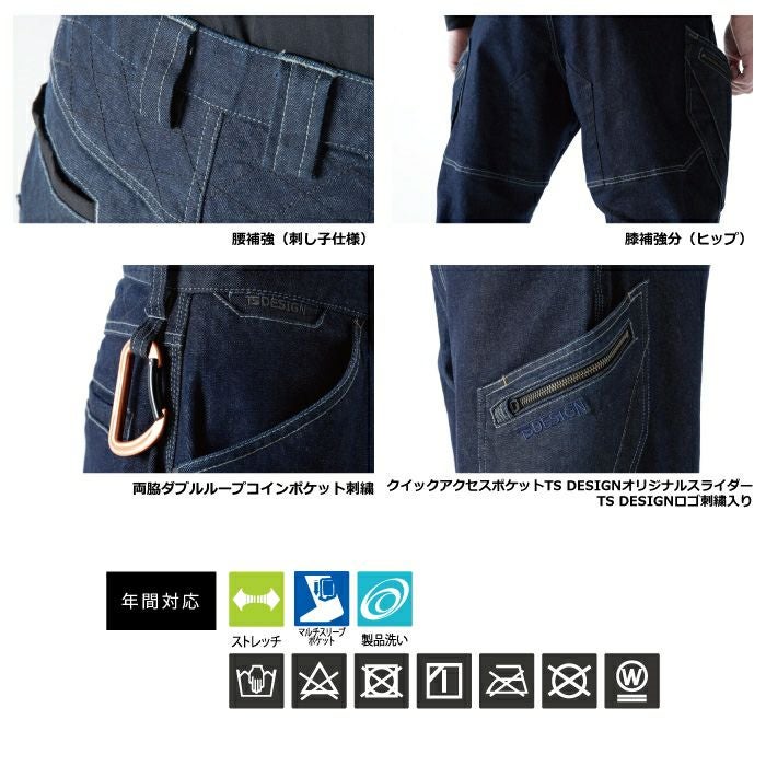 ●関連商品※5234メンズニッカーズ中綿キルティングカーゴパンツ※5134メンズニッカーズカーゴパンツ※51345メンズニッカーズショートカーゴパンツ●オールシーズン用●素材:ストレッチデニム 綿98% ポリウレタン2% [別布]ナイロン100%●ストレッチ、製品洗い、クイックアクセスポケット、腰補強(刺し子仕様)、補強部分(ヒップ)、両脇ダブルループ、コインポケット刺繍、クイックアクセスポケット、TS DESIGNオリジナルスライダー、TS DESIGNロゴ刺繍入り●サイズ:S(ウエスト/74、股上/24、股下/34)、M(ウエスト/78、股上/26、股下/34)、L(ウエスト/82、股上/26、股下/34)、LL(ウエスト/86、股上/28、股下/34)、3L(ウエスト/90、股上/28、股下/34)、4L(ウエスト/96、股上/30、股下/34)、5L(ウエスト/102、股上/30、股下/34)、6L(ウエスト/110、股上/32、股下/34)●カラー:ネイビー、ブラック