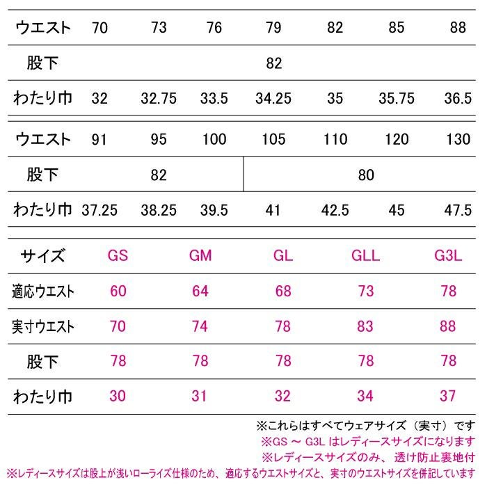 信頼の日本製T/Cヘリンボーンを使用。東レライトフィックスにより軽くて伸びる快適な着心地。不快なニオイを軽減するデオドラントテープ付き。窮屈感を感じさせない適度なストレッチ性。制電性素材で静電気の発生を抑える。レディースサイズ対応商品。GS~G3Lは、レディースサイズになります。レディースサイズは股上が浅いローライズ仕様のため、適応するウエストサイズと、実寸のウエストサイズを併記しています。