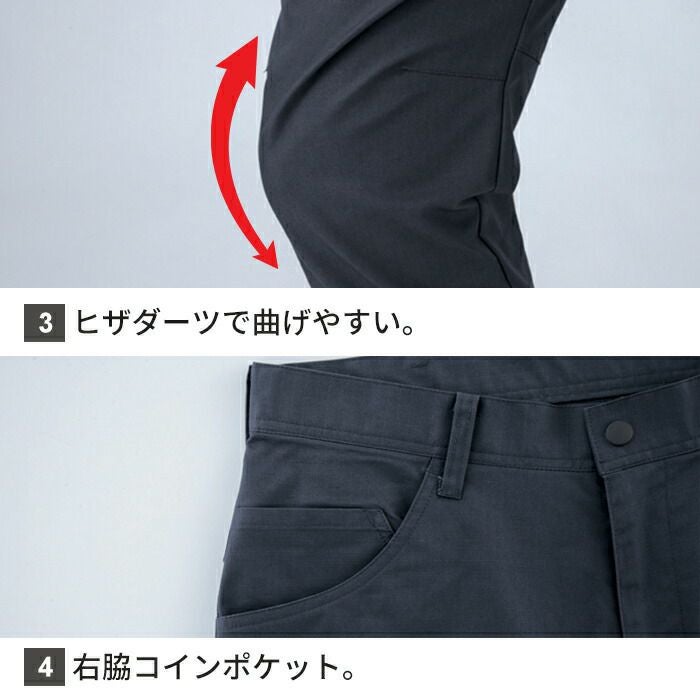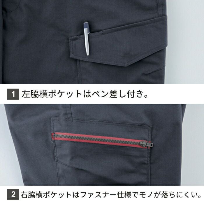 ◇機能:左脇横ポケットはペン差し付き、右脇横ポケットはファスナー仕様でモノが落ちにくい、ヒザダーツで曲げやすい、右脇コインポケット、両脇Dカンループ付き