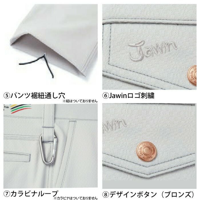 ◇機能:タックボタン(ゴールド)、デザインボタン(シルバー、ブロンズ)、リベット、消臭&抗菌テープ、パンツ裾紐通し穴、Jawinロゴ刺繍、カラビナループ、プリント