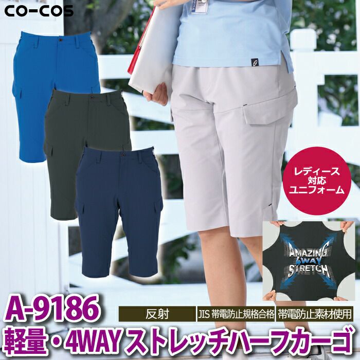 コーコス 作業服 春夏用 A-9186 軽量・4WAYストレッチハーフカーゴ 3L