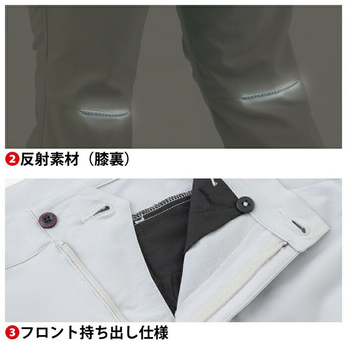 ◇機能:クライミングカット・フロント持ち出し仕様・反射素材(膝裏)・両脇カラビナループ付・両脇コインポケット付・スマホも入る右サイドマルチポケット・裾サイドアジャスター・オールシーズン対応素材・JIS帯電防止規格合格・帯電防止素材使用・ストレッチ・樹脂穴ボタン