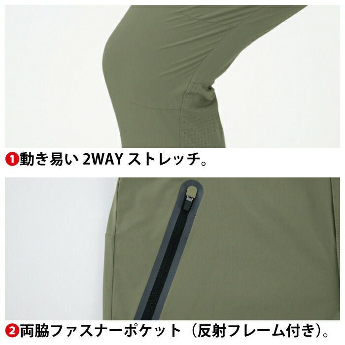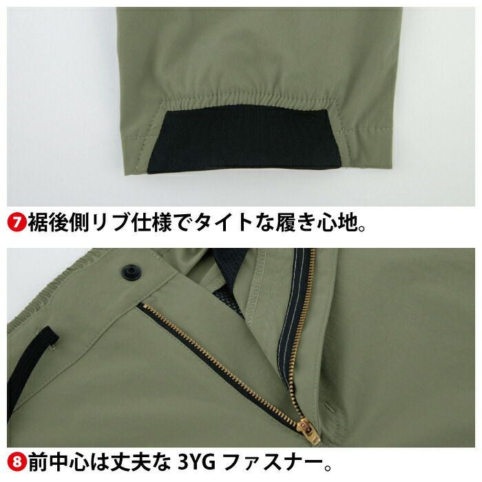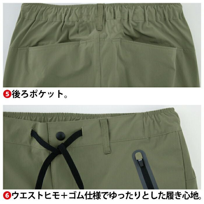 ◇機能:動きやすい2WAYストレッチ。両脇ファスナーポケット(反射フレーム付き)。両前膝反射プリント入り。両後身頃反射プリント入り。後ろポケット。ウエストヒモ+ゴム仕様でゆったりとした履き心地。裾後ろ側リブ仕様でタイトな履き心地。前中心は丈夫な3YGファスナー