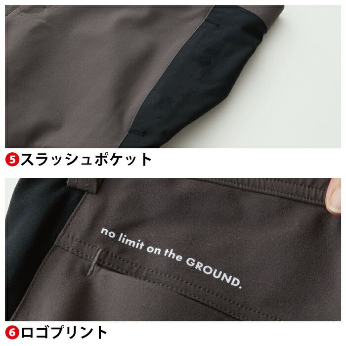 ◇機能:制電性素材・ストレッチ・イージーケア・後ろ太ベルトループ・タックボタン・ファスナーポケット(野帳が入る)・ペン差し・スラッシュポケット・ロゴプリント