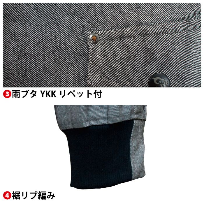 ◇機能:スーパーストレッチ・タテムラ糸・長財布が入る後ろポケット・右カーゴポケットペン差し・雨ブタYKKリベット付・裾リブ編み・股部分アーチカット