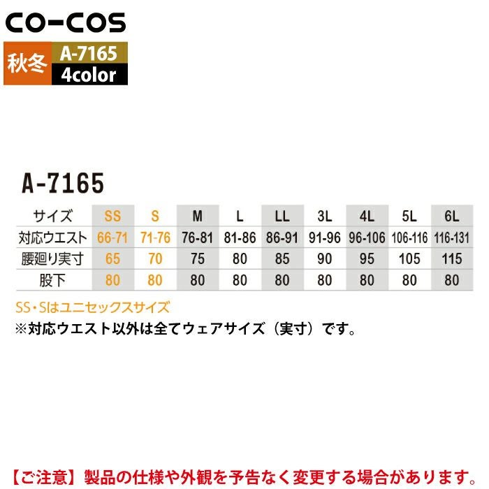 コーコス 作業服 秋冬用 A-7165 ストレッチカーゴパンツ SS-LL