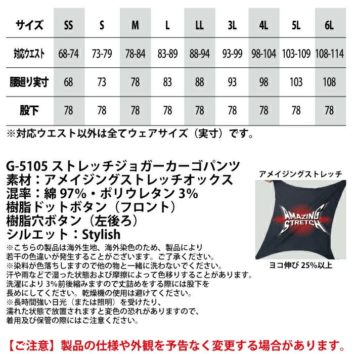 コーコス 作業服 作業着 作業ズボン コーコス 作業服 春夏用 G-5105 ストレッチジョガーカーゴパンツ SS-6L