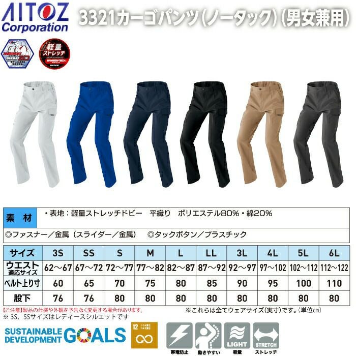 アイトス Aitoz 作業服 作業着 作業ズボン アイトス 作業服 作業着 Aitoz 秋冬用 AZ-3321 カーゴパンツ (ノータック)(男女兼用) 3S-LL