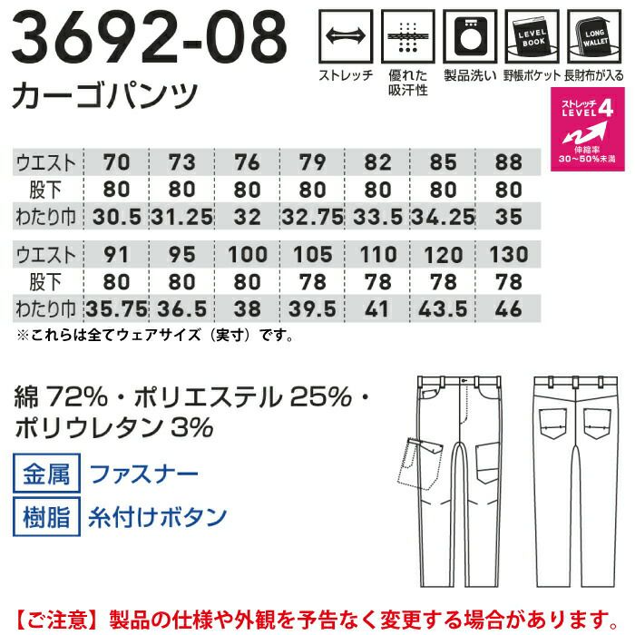 桑和 SOWA 作業服 作業着 作業ズボン 桑和 SOWA 作業服 オールシーズン 3692-08 カーゴパンツ 105-110