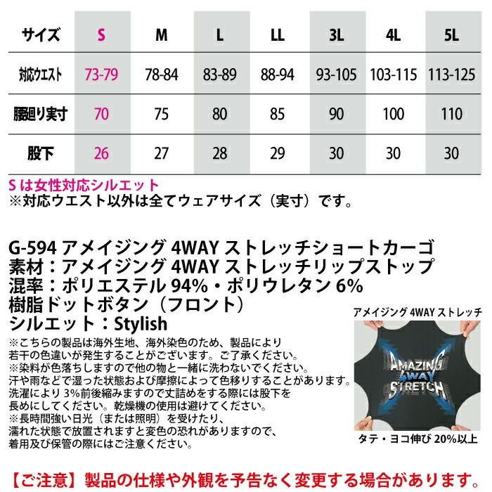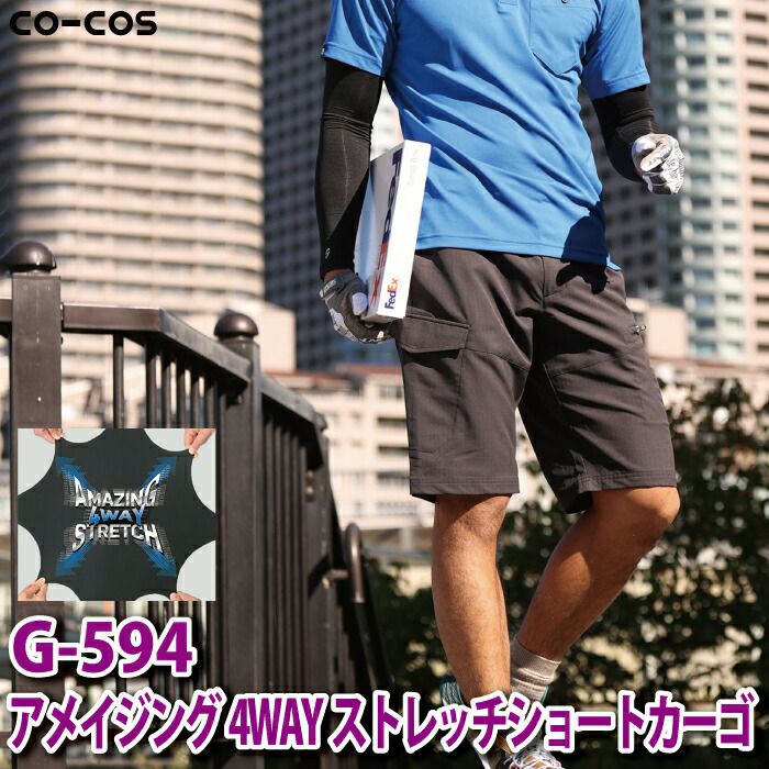 コーコス 作業服 作業着 作業ズボン コーコス 作業服 春夏用 G-594 アメイジング4WAYストレッチショートカーゴ 4L-5L
