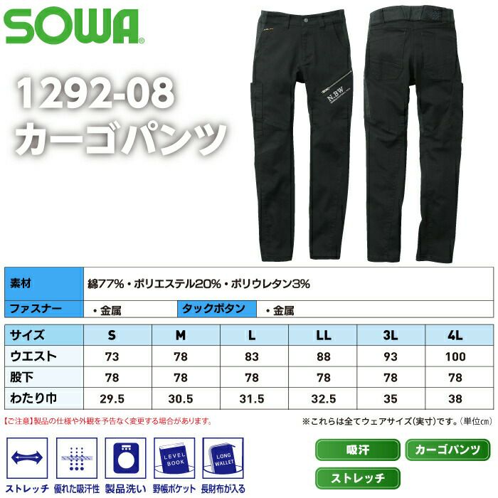 桑和 SOWA 作業服 作業着 作業ズボン 桑和 SOWA 作業服 秋冬用 1292-08 カーゴパンツ S-LL