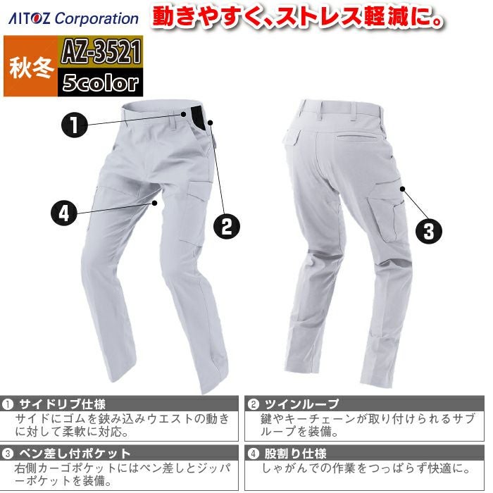 アイトス Aitoz 作業服 作業着 作業ズボン アイトス 作業服 作業着 Aitoz 秋冬用 AZ-3521 カーゴパンツ(ノータック)(男女兼用) 3L-4L