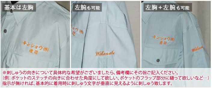 ※ この他にも様々なご要望に対応できます(例:刺繍色を2色にする、社名の行数を2行にする、ポケットの縫い目に合わせて揃える、etc)