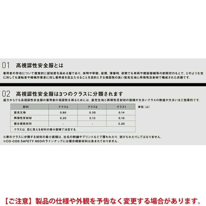 ◇高視認性安全服とは・着用者の存在について視覚的に認知度を高める服であり・未明や早朝・昼間・薄暮時・夜間でも車両や建設機械等の前照灯のもとで・どのような光に対しても運転者や機械作業者にたいし着用者を目立たせることを目的とする視認性の高い蛍光生地と再帰性反射材で構成された衣服です。