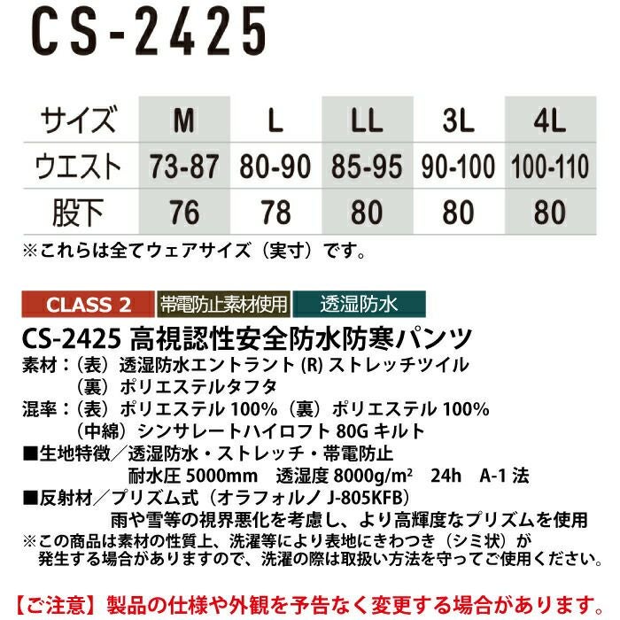 ポイント消化 警備服・防犯商品 秋冬用 コーコス CS-2425 高視認性安全防水防寒パンツ M-LL