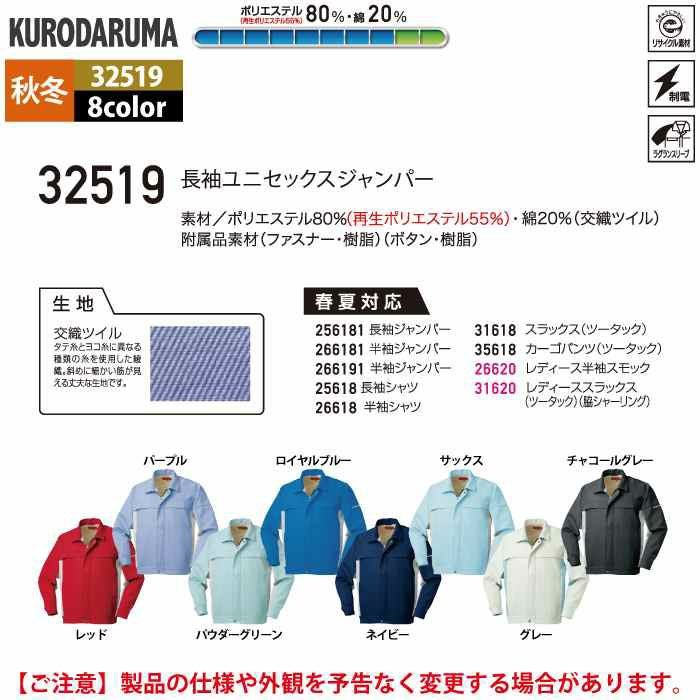 作業服 作業着 クロダルマ 作業服 秋冬用 32519 長袖ユニセックスジャンパー SS-LL