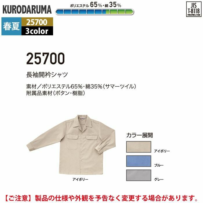 作業服 作業着 クロダルマ 作業服 春夏用 25700 長袖開衿シャツ 3L-5L