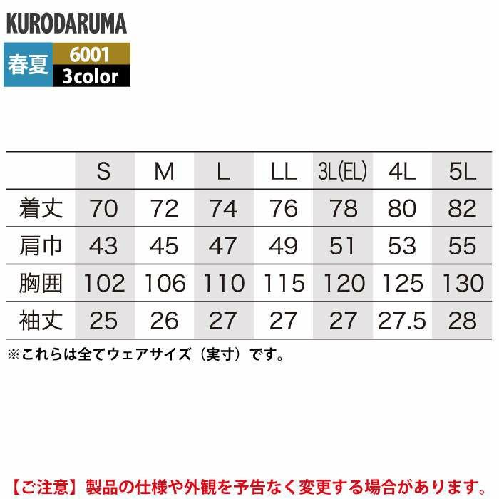 作業服 作業着 クロダルマ 作業服 春夏用 6001 半袖開衿シャツ 3L-5L