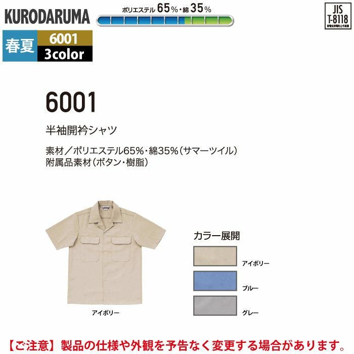 作業服 作業着 クロダルマ 作業服 春夏用 6001 半袖開衿シャツ S-LL