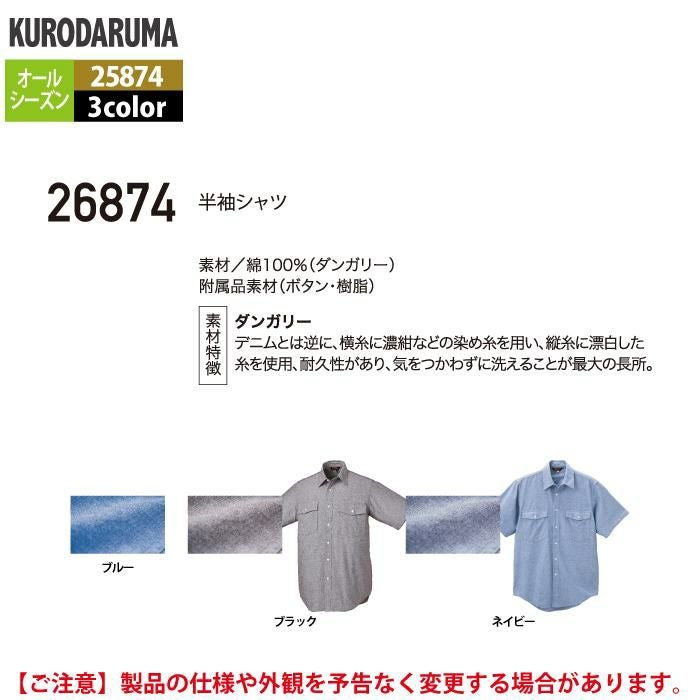 作業服 作業着 クロダルマ 作業服 オールシーズン 26874 半袖シャツ S-LL