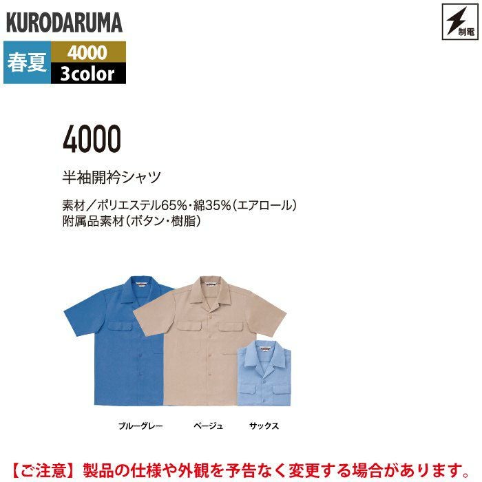 作業服 作業着 クロダルマ 作業服 春夏用 4000 半袖開衿シャツ S-LL