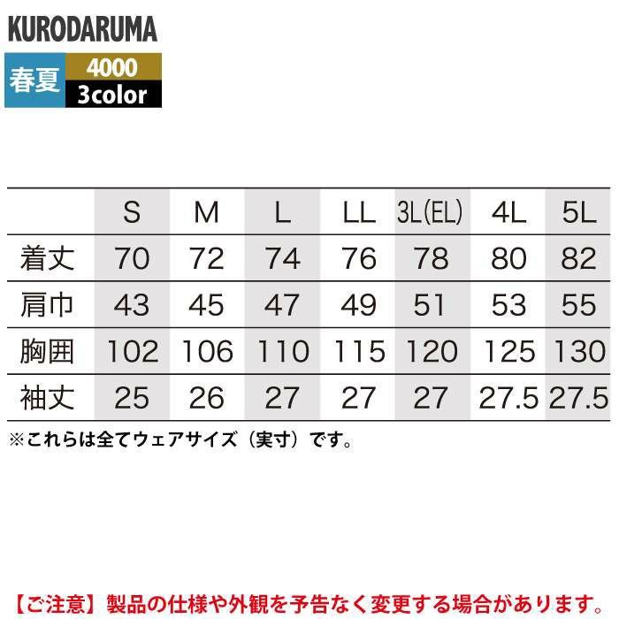 作業服 作業着 クロダルマ 作業服 春夏用 4000 半袖開衿シャツ 3L-5L