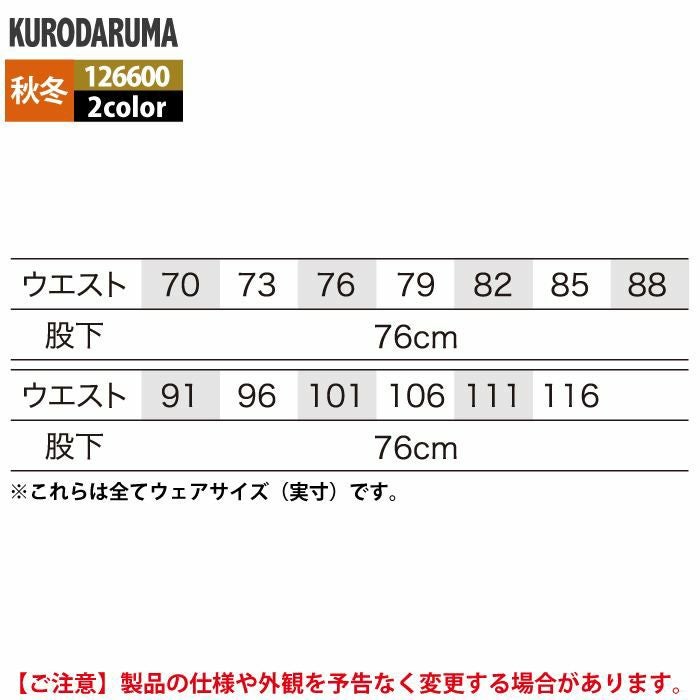 作業服 作業着 クロダルマ 作業服 秋冬用 126600 スラックス(ノータック) 70-88