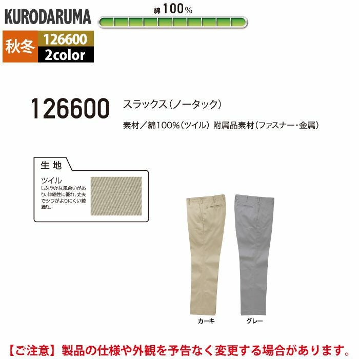作業服 作業着 クロダルマ 作業服 秋冬用 126600 スラックス(ノータック) 91-116