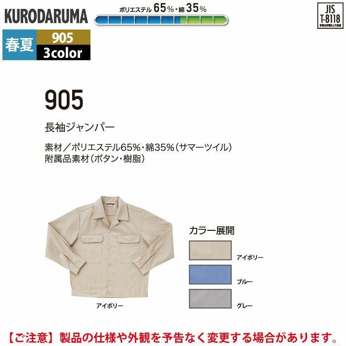 作業服 作業着 クロダルマ 作業服 春夏用 905 長袖ジャンパー 3L-5L