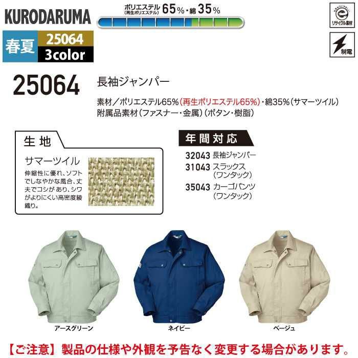作業服 作業着 クロダルマ 作業服 春夏用 25064 長袖ジャンパー M-LL