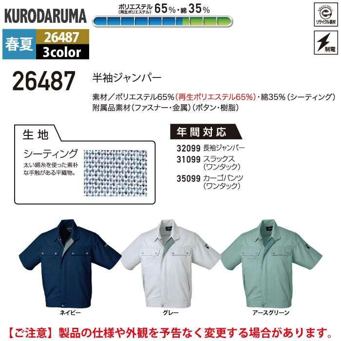 作業服 作業着 クロダルマ 作業服 春夏用 26487 半袖ジャンパー S-LL