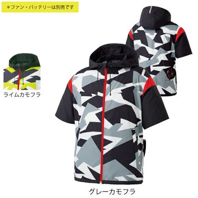 ●関連商品※KU92052フード付ベスト●春夏用●素材:タフタ●混率:ポリエステル100%、ファスナー/[フロント]コイル(引き手 金属) [両脇ポケット]コイル(引き手 金属)●UVカット、特許取得、半袖タイプ、フード付き、風気路、フードリフレクター、裾アジャスターゴム、両脇ファスナーポケット(ケーブルホール付)、左袖ペン差し、ファン用取り付け部、保冷剤用メッシュポケット●サイズ:M(着丈/67、肩巾/47、袖丈/24、胸囲/114)、L(着丈/69、肩巾/49、袖丈/25、胸囲/118)、LL(着丈/71、肩巾/51、袖丈/26、胸囲/122)、3L(着丈/73、肩巾/53、袖丈/27、胸囲/130)●カラー:グレーカモフラ、ライムカモフラ