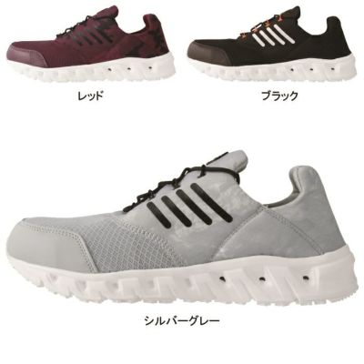 ●オールシーズン用●男女兼用、通気性、衝撃吸収、抗菌・防臭中底、耐油性ゴム底、軽量SPソール、耐滑ソール、JSAA規格 A種認定品※踵部の衝撃エネルギーの吸収性※耐滑性、セメント製法、鋼製先芯、甲被クロロプレン+メッシュ、靴底EVA+ラバー、ウィズEEE、重量710g(26.0cm/両足)、ベンチレーションシステムで空気を循環させ快適な履き心地、耐滑性に優れた素材と意匠によるホワイトソール。床面の汚れを気にする職種にオススメ、踵を踏んで履くことができ、着脱がしやすい仕様●カラー:シルバーグレー、レッド、ブラック