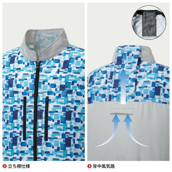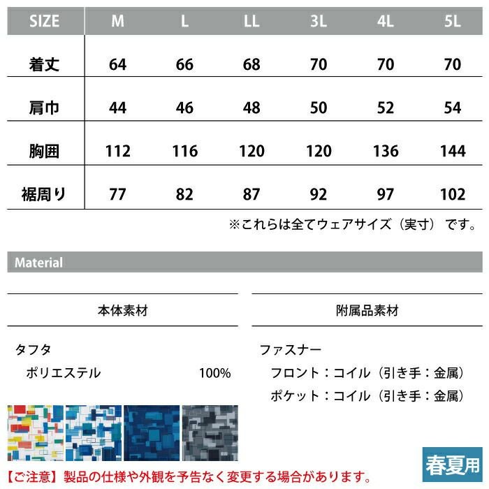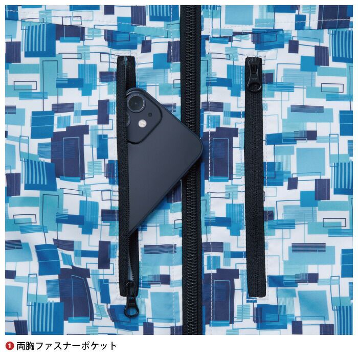 ◇機能:UVカット素材・両胸ファスナーポケット・ベストタイプ・立衿・ブロック柄・風気路