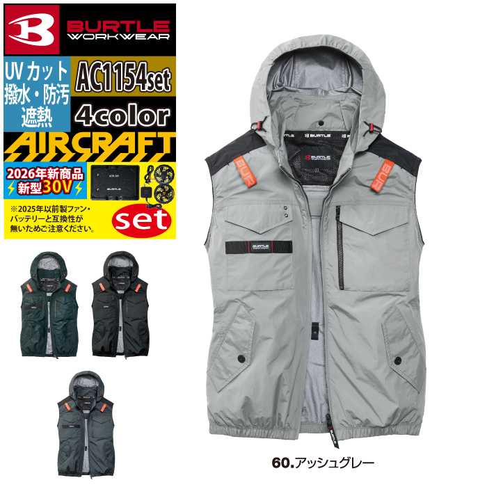 2026新型30Vバッテリー&30V対応ファンセット バートル BURTLE 作業着 2026春夏新作 エアークラフト AC1154ベスト+ファン+バッテリー 30Vフルセット AC10 AIRCRAFT