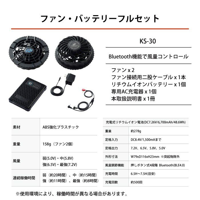 作業着 作業着 電動ファン 熱中症 クロダルマ 作業服 KS-30 空調ファンバッテリーフルセット F ファン付きウェア