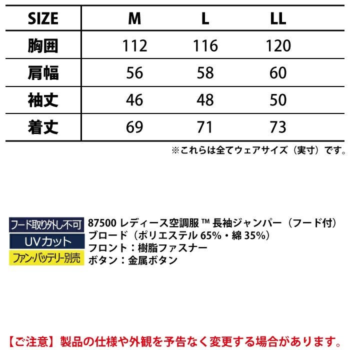 空調服 自重堂 作業服 作業着 空調服 自重堂 作業服 87500 レディース空調服長袖ジャンパー(フード付き) M-LL 作業着 春夏用 熱中症 レジャー アウトドア スポーツ