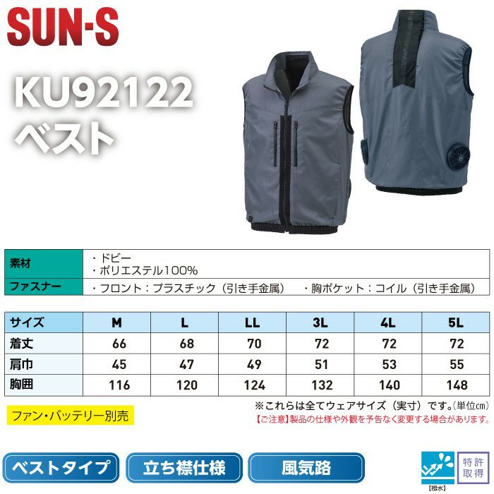 空調服 サンエス 作業服 作業着 ファン付きウェア (服のみ) 春夏 風神服 サンエス 作業服 KU92122 ベスト M-5L 作業着