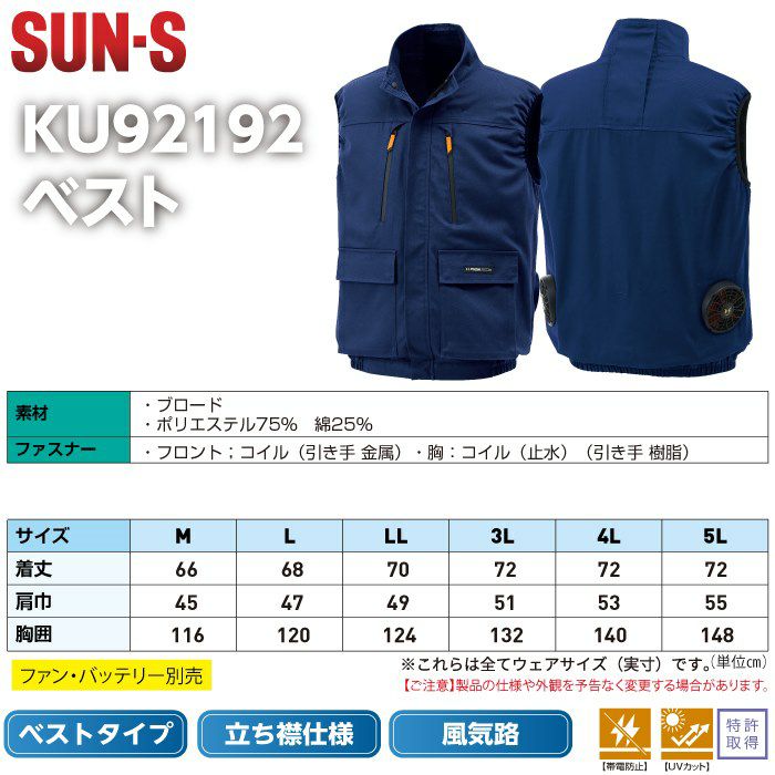 空調服 サンエス 作業服 作業着 ファン付きウェア (服のみ) 春夏 風神服 サンエス 作業服 KU92192 ベスト M-5L 作業着