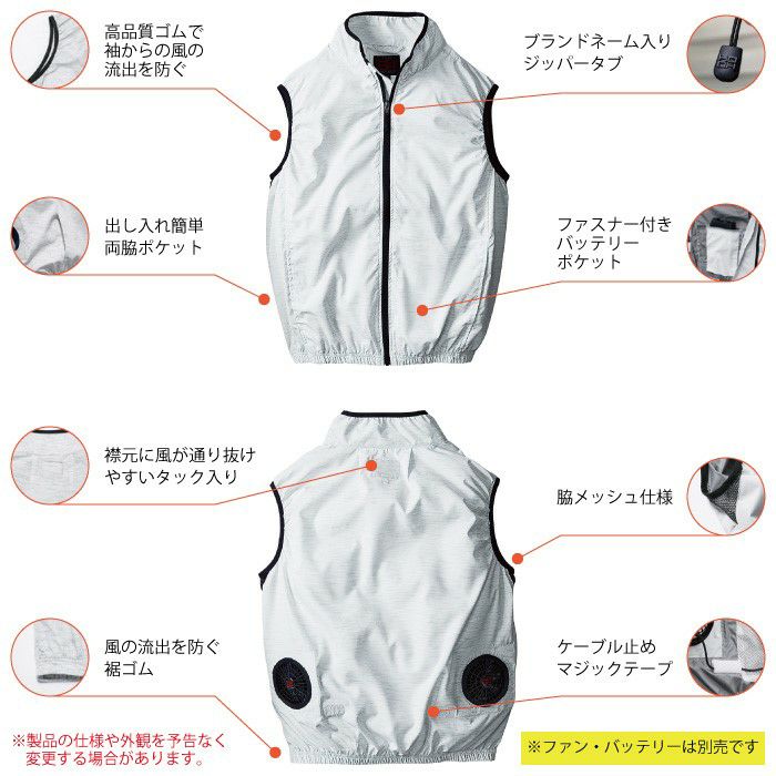 ●春夏用●素材:ポリエステル100%●脇メッシュ仕様、高品質ゴムで袖からの風の流出を防ぐ、出し入れ簡単脇ポケット、襟元に風が通り抜けやすいタック入り、風の流出を防ぐ裾ゴム、ファスナー付きバッテリーポケット、ケーブル止めマジックテープ●サイズ:M、L、LL、3L、4L、6L、8L●カラー:スラブネイビー、スラブホワイト、スラブブラック