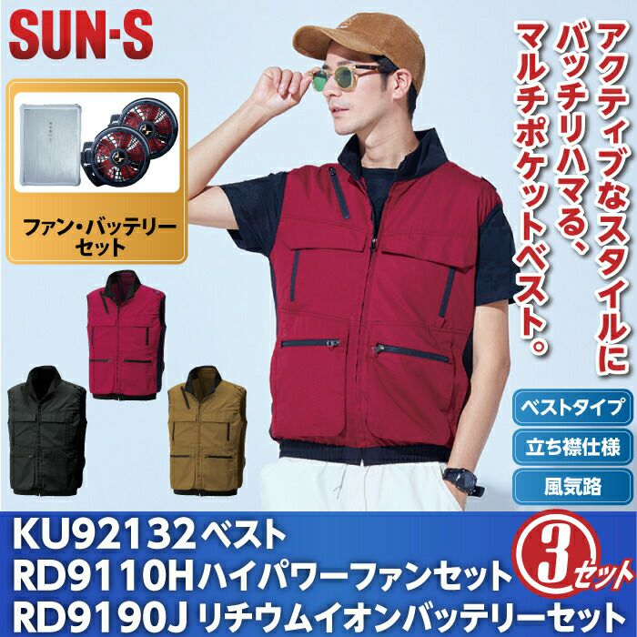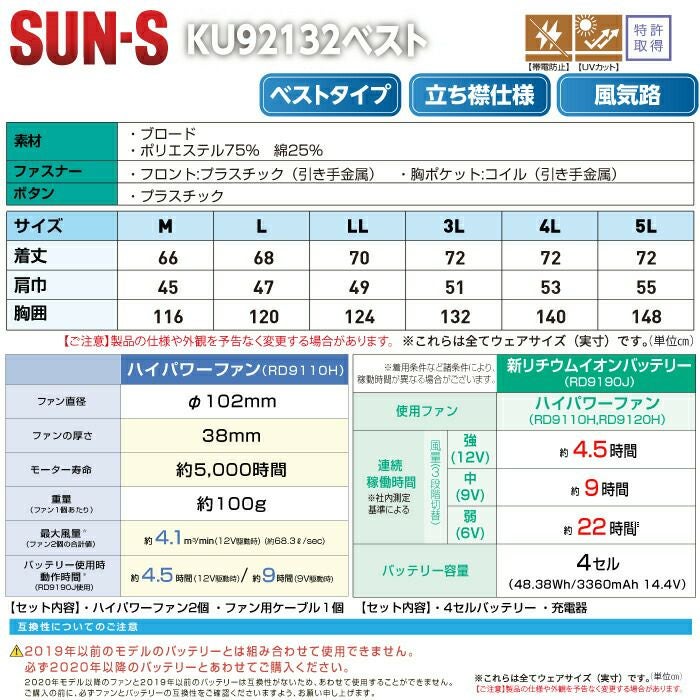 ファン対応ウェア 春夏用 サンエス KU92132setR3 ベスト ファンとバッテリセット M-5L
