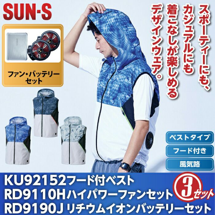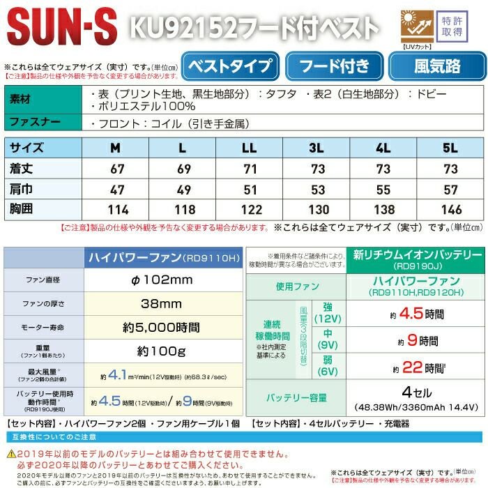 ファン対応ウェア 春夏用 サンエス KU92152setR3 フード付ベスト ファンとバッテリセット M-5L