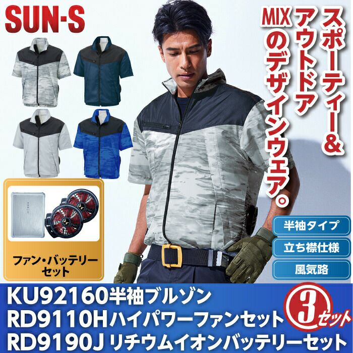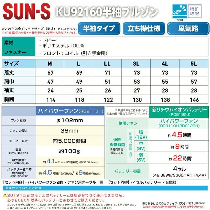 ファン対応ウェア 春夏用 サンエス KU92160setR3 半袖ブルゾン ファンとバッテリセット M-5L