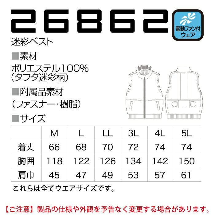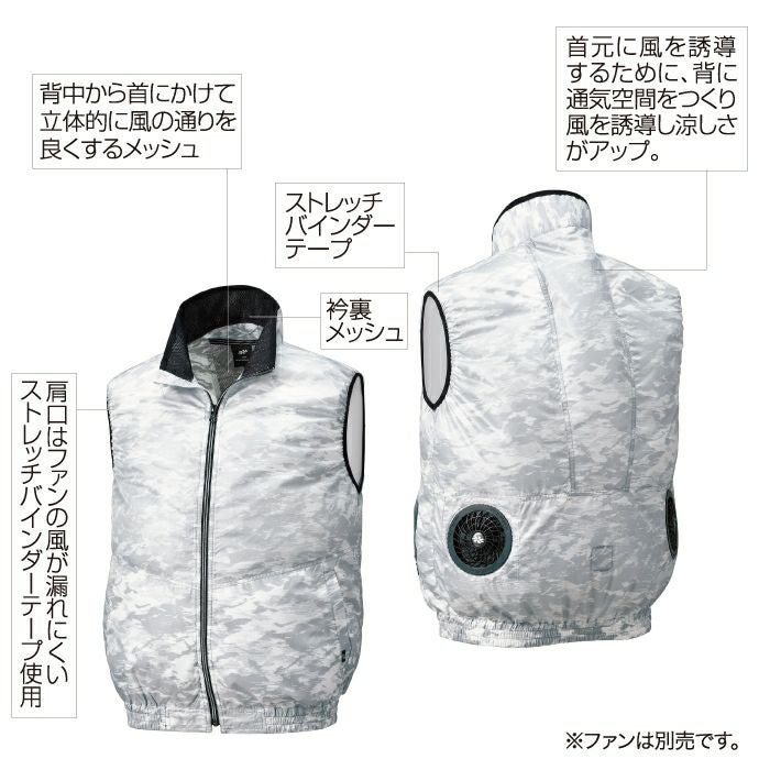 作業着 空調服 電動ファン 熱中症 ベスト 涼しい ファン付きウェア (服のみ) クロダルマ 作業服 26862 空調エアセンサー迷彩ベスト M-5L 春夏用