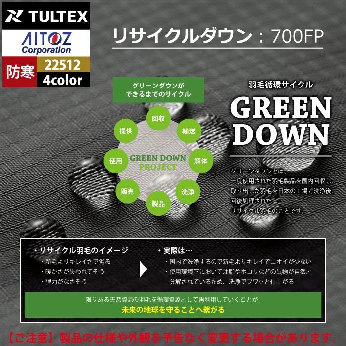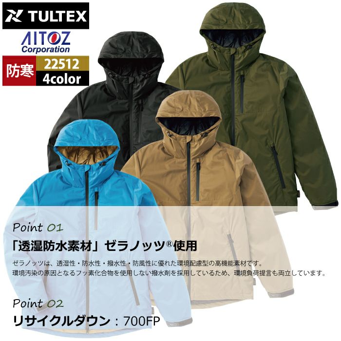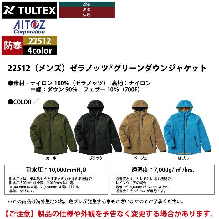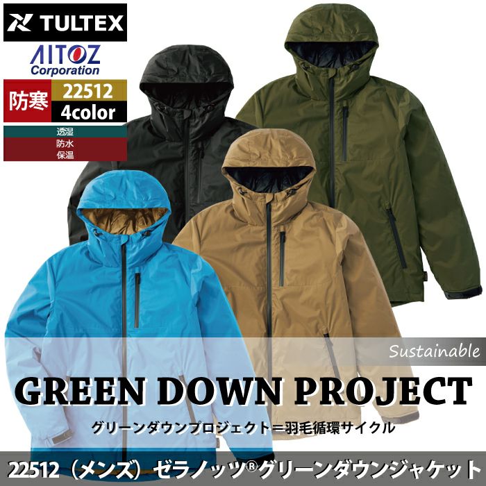 アウトドア 秋冬用 アイトス Aitoz 22512 ゼラノッツグリーンダウンジャケット(メンズ) M-3L