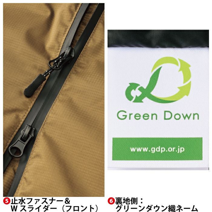 ◇機能:透湿・防水・保温・耐水圧:10 000mmH2O・透湿度:7 000g/m2/hrs.・止水ファスナー(左胸ポケット)・止水ファスナー(脇ポケット)・袖口ラバーアジャスター・生地:透湿防水ゼラノッツ(R)・止水ファスナーとWスライダー(フロント)・裏地側:グリーンダウン織ネーム