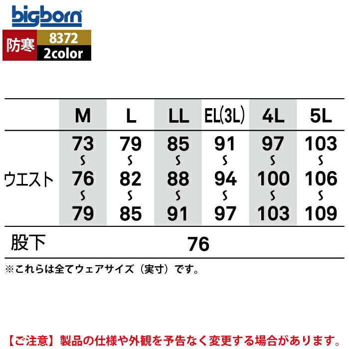 ビッグボーン bigborn 作業服 防寒着 8372 防寒パンツ 5L 秋冬 作業着